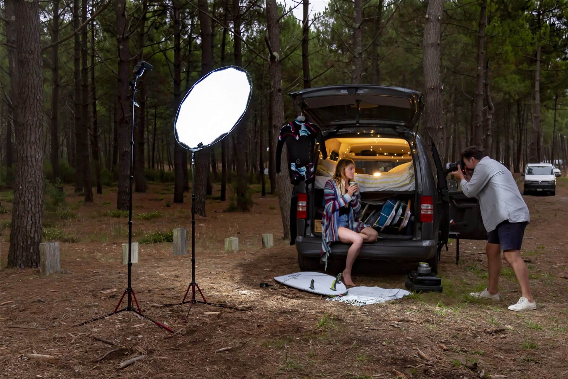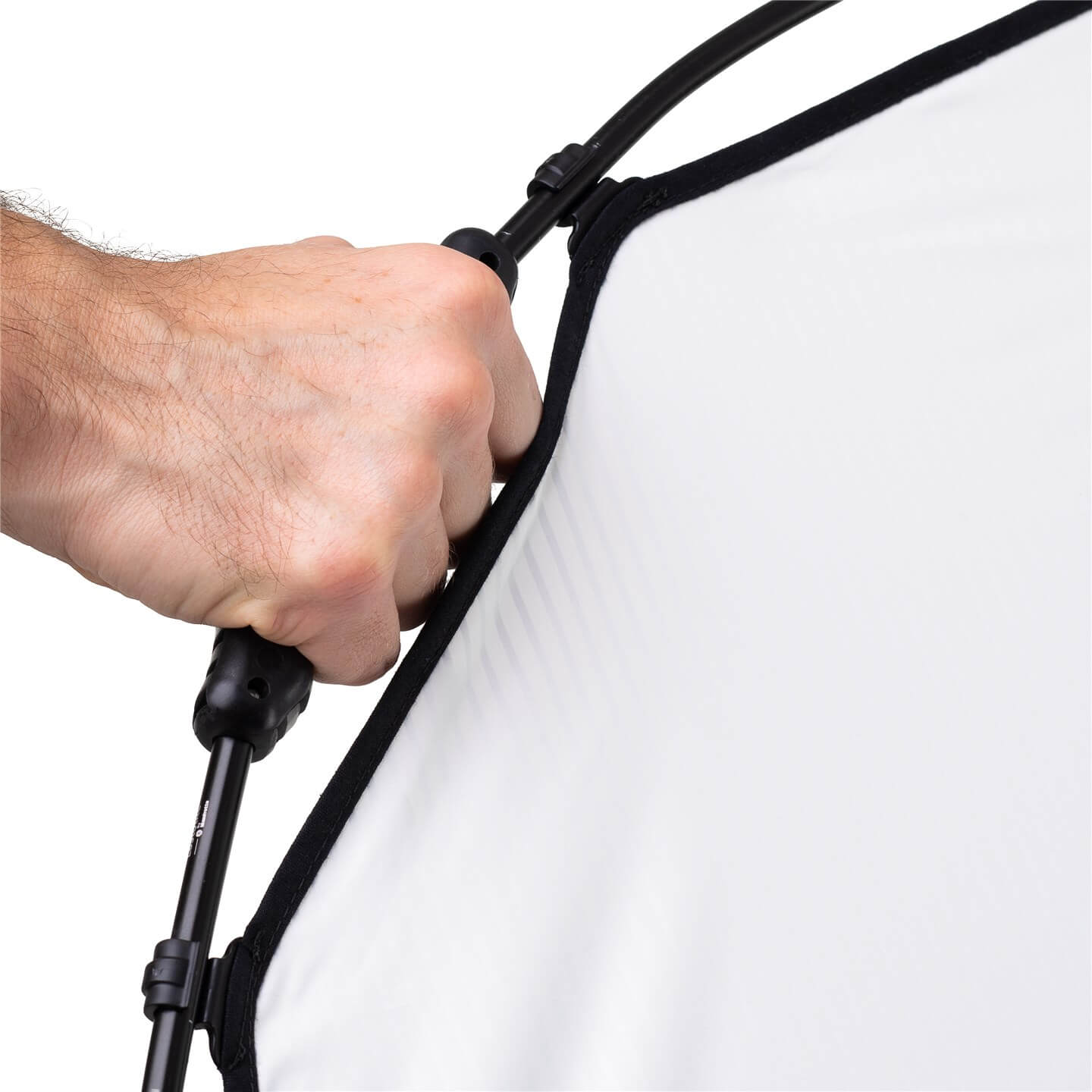 Cienka tkanina dyfuzyjna o gęstości 2 f-stop posiada naniesione z jednej strony srebrne paseczki wspomagające odbijanie.
