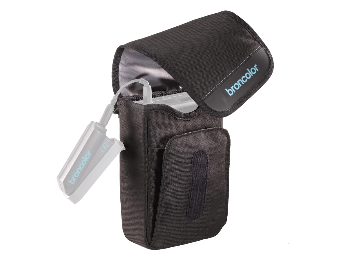 Pokrowiec umożliwia wygodne przenoszenie akumulatora na ramieniu lub zawieszenie, gdy głowica MobiLED jest podłączona bezpośrednio do niego i wykorzystywana jako źródło światła ciągłego.