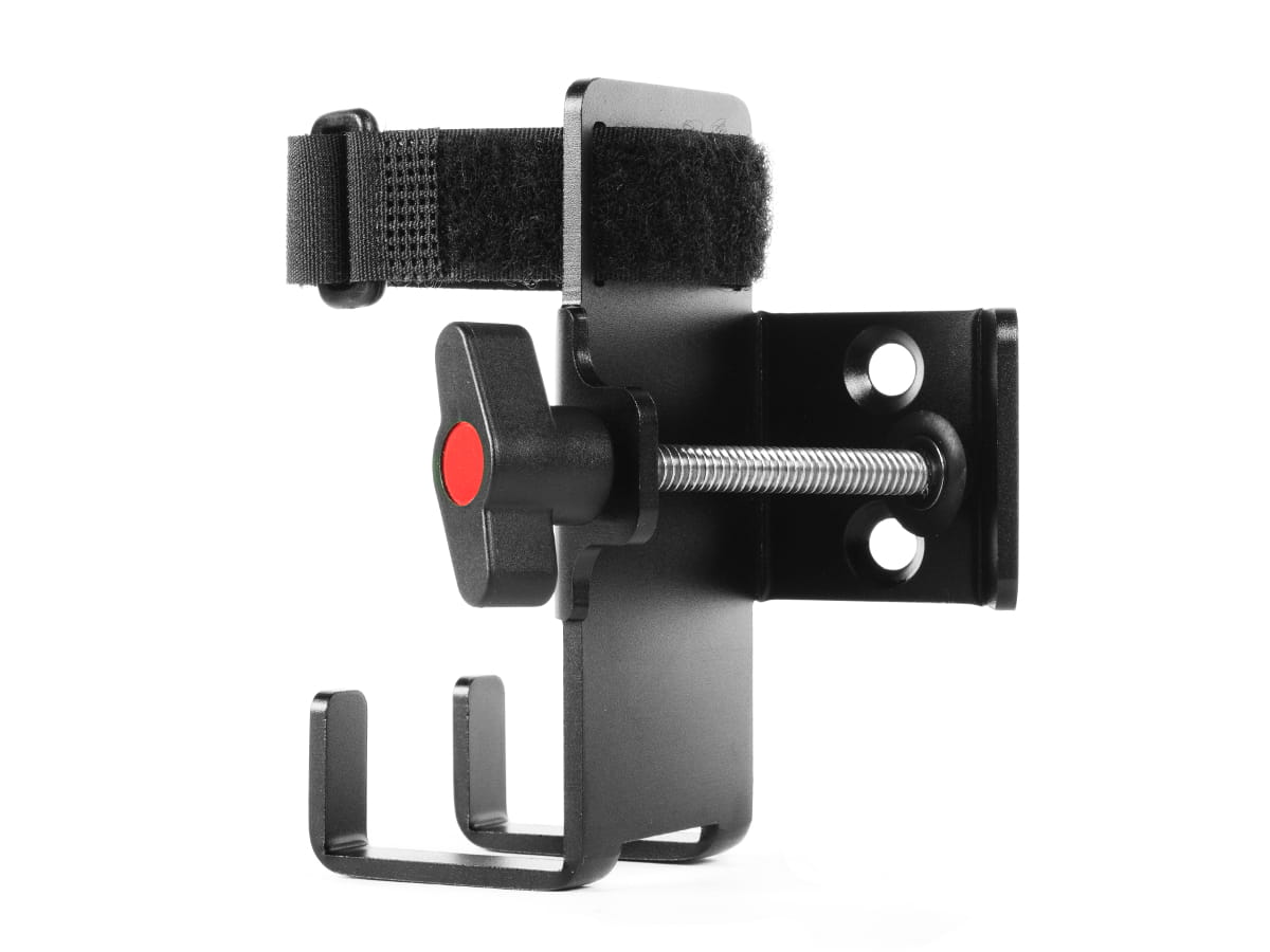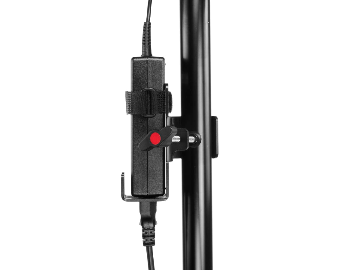 Uchwyt do zasilaczy lamp i kontrolera DMX. Umożliwia bezpieczne zamocowanie do statywów oświetleniowych zasilaczy lamp i utrzymanie w porządku kabli.